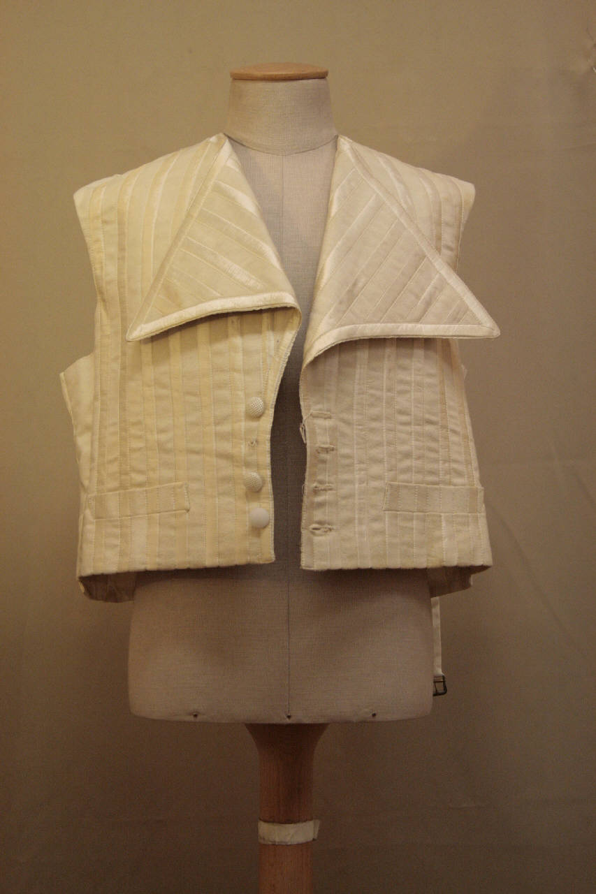 Completo in tre pezzi in panno color panna. Spencer con collo con amplissimi risvolti che arrivano sino alla pala, apertura completa anteriore, segnata da otto bottoni in plastica non funzonali; due tasche con patta dritta cucita, dorso in un pezzo; maniche dritte lunghe in due pezzi con spacco al polso chiuso da tre bottoni e sottolineato da una gala plissettata in taffetas sintetico bianco. Fodera in diagonale di cotone bianco .Gilè ad un petto, tagliato in vita, con quattro occhielli e tre bottoni (il quarto andato perso), collo con ampio risvolto, due tasche con patta cucita. E' confezionato in panno avotrio decorato da bande in taffetas bianco cucite a macchina. Dorso in raso di cotone bianco, con cucitura centrale e cinturino con fibia in metallo. Fodera nello stesso raso.Pantaloni alti in vita, patta alla marinara, con apertura centrale anteriore verticale, chiusa da due bottoni e altrettanti occhielli, la patta è abbottonata mediante otto automatici ed è decorata da dieci bottoni non funzionali. Due tasche sagomate inserite nella cucitura sui fianchi; dorso con spacco al centro, segnato da due bottoni, e cinturino con fibia metallica. Pantalone a gamba larga. Sul rovescio, all'altezza della vita foderata in diagonale di cotone, sono cuciti quattro bottoni.