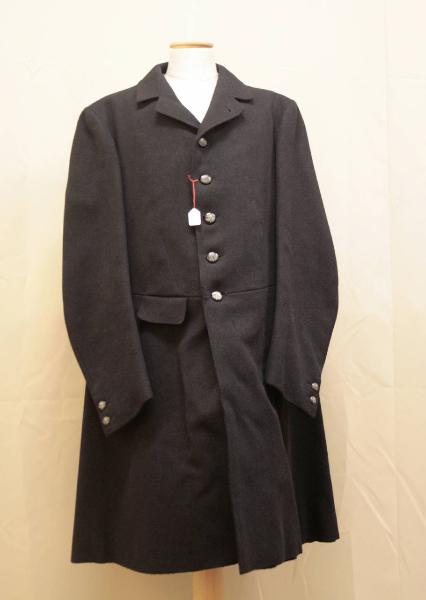 Soprabito in panno nero, con collo e ampio risvolto, chiuso da bottoni con monogramma coronato. Taglio al punto vita, da cui partono due pinces ed è inseita una tasca con patta sagomata. Le falde si uniscono sul dorso, in uno spacco sovrapposto, in corrispondenza del taglio al centro. Due bottoni segnano il punto vita. Maniche in due pezzi con una coppia di bottoni e occhielli. Fodera in diagonale di lino a righe écru, beige e verde; le falde sono foderate in tela cerata nera.