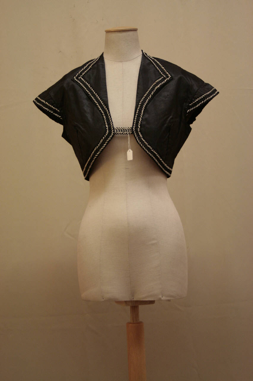 Bolero in taffetas nero, collo con risvolto, rifinito, come l'orlo e le corte maniche, con una passamaneria in cordoncino di seta nero e bianco. Pinces anteriormente e fianchetti sul dorso modellano il capo. Maniche ad aletta. Fodera in tela di cotone beige. Il capo è chiuso da un alamare realizzato con la stessa passamaneria e chiusa da una parte mediante ganci e asole.
