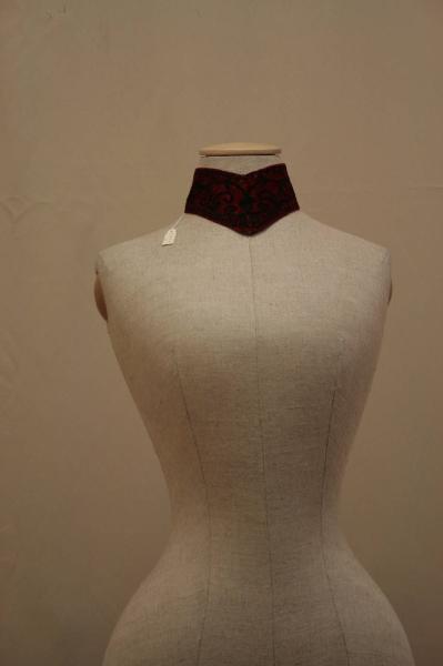 Colllo di forma quasi circolare, confezionata in velluto rosso, ricamato in seta nera con motivo floreali; intorno allo scollo corre un collo a cinturino con bori smerlato chetrattiene una gala a due embi che che terminano a punta.. Allacciatura completa data da tre automatici (uno su colletto a cinturino e due su quelo a pellegrina). Orlo sottolineato da una frangia nera con briglie definite da fiocchi. Fodera in taffetas nero. Colletto a fascia, di forna a V , chiuso da tre ganci e latrettante asole in seta, poste sui lati brevi, mentre sui lati obliqui esterni sono cuciti due ganci maschi.\nCompelta l'insieme un oannello rettangolare ricamato, forse una prova.