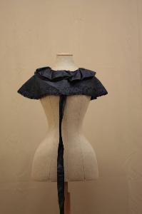 Collo alla pellegrina in taffetas nero, a due strati, quello superiore, in due strati, a gale, e quello inferiore porta, lungo il bordo, un ricamo in perline che disegna volute, mentre l'orlo è rifinita da una farngia eseguita con un nastri di taffetas tagliato. Doppito in taffetas. Chiusura data da un nastro in taffetas nero..