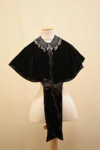 Matellina a forma circolare, corta sotto il seno, con lembo lungo sul davanti, all'altzza della vita presenta un motivo a pieghe e un fiocco in raso nero. Colletto piatto in raso nero decoratoda una passamaneria in filo di seta nero e da piccole perle in legno ricopret da filo in seta écru e nero. Allacciatura definita da otto ganci in metalo, Fodera in raso nero