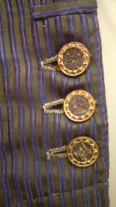Calzoni in pekin liserè, decorato da righine marroni e viola. Alta cintura sagomata con due tasca a patta cucita, patta verticale chiusa da cinque da cinque bottoni e altrettanti occhielli; due tasche con patta ad una punta, con bottone ed occhiello, ai lati della patta; due tasche sagomate inserite nella cucitura sui fianchi e chiuse da bottoni. La cintura prosegue sul dorso dove accoglie quattro occhielli. Ogni calzone è fermato al ginocchio da tre bottoni con paillettes. Parziale fodera in tela di lino.