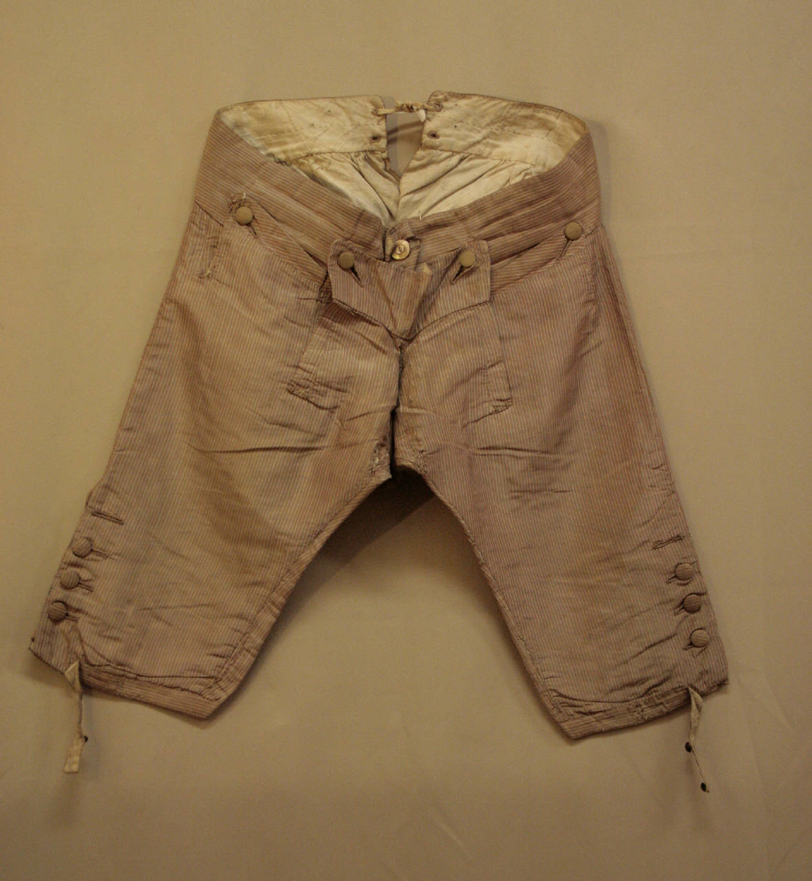 Calzoni in taffetas rigato nero, rosa ed ècru. Alta cintura sagomata, patta alla marinara, con apertura centrale anteriore verticale, chiusa da due bottoni, la patta è abbottonata mediante tre bottoni. Due tasche sagomate inserite nella cucitura sui fianchi e chiuse da bottoni. La cintura prosegue sul dorso dove, accoglie quattro occhielli; il dorso è contraddistinto da una lieve arricciatura. Ogni calzone è fermato al ginocchio da quattro bottoni, con altrettanti occhelli, e da un cinturino con bottone e occhiello. Fodera in tela di lino.