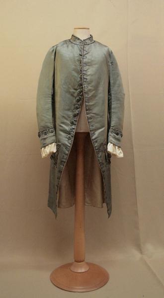 Marsina in raso celeste ricamata con strass. Colletto a fascia, mostre sfuggenti dove sono dodici bottoni non funzionali rivestiti in tessuto e ricamati con strass e canutiglia, chiusura data da due ganci. Tasca con patta e decorata da quattro bottoni. Falde che si riuniscono posteriormente in piegoni e spacco centrale, punto vita ribassato segnato da bottoni. Maniche in due pezzi dritta, terminante con paramani con tre bottoni. Fodera in raso avorio, maniche e dorso in tela di lino.