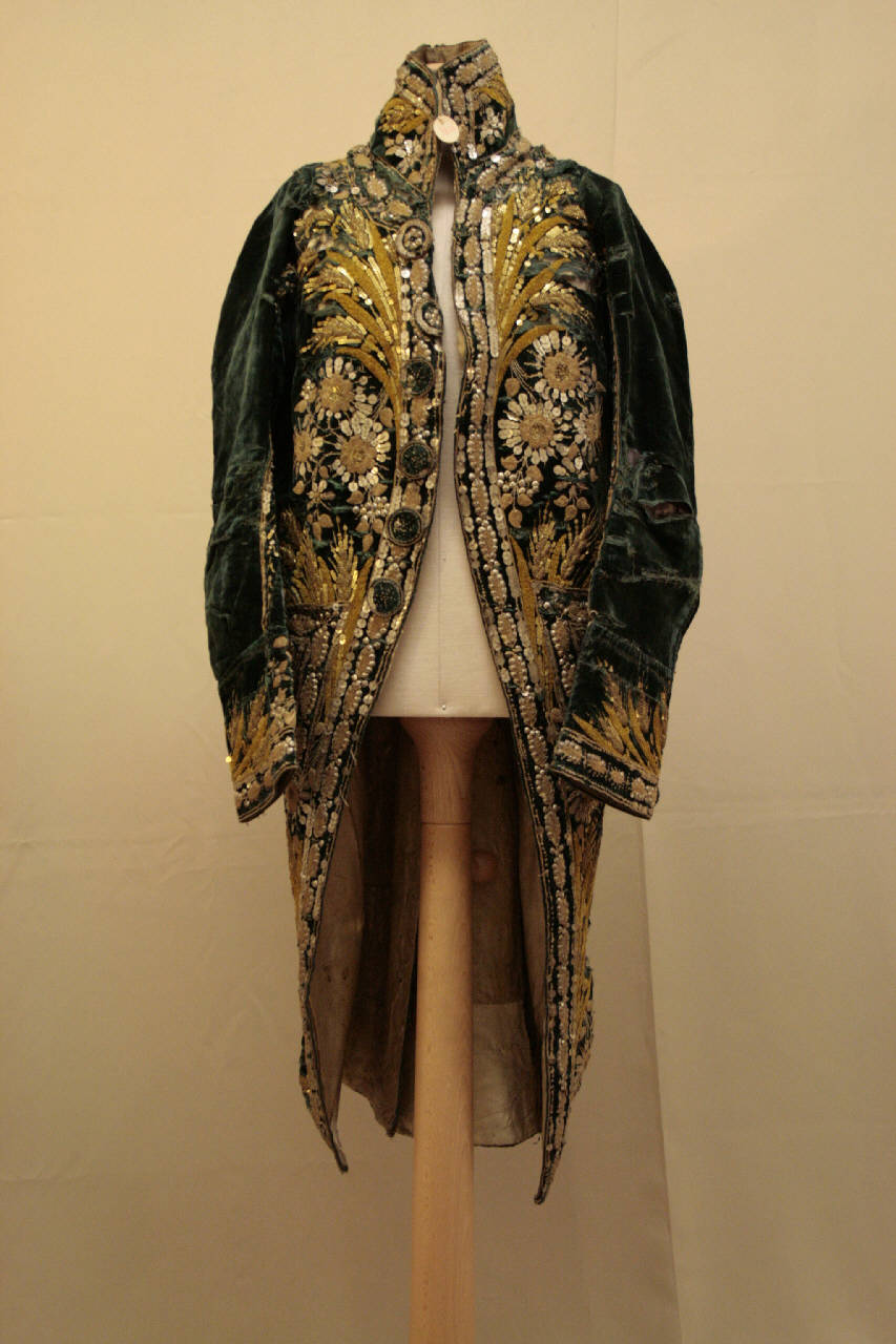 Marsina confezionata in velluto verde ricamato con motivi di spighe e margherite stilizzate. Alto colletto a fascia, mostre molto sfuggenti dove sono sei bottoni ricamati. Tasca con patta e decorata da tre bottoni. Falde che si riuniscono posteriormente in piegoni chiusi e spacco centrale, punto vita ribassato segnato da bottoni. Maniche in due pezzi dritta, terminante con paramani con un bottone. Fodera in taffetas e diagonale écru, dorso e maniche in tela di lino écru.