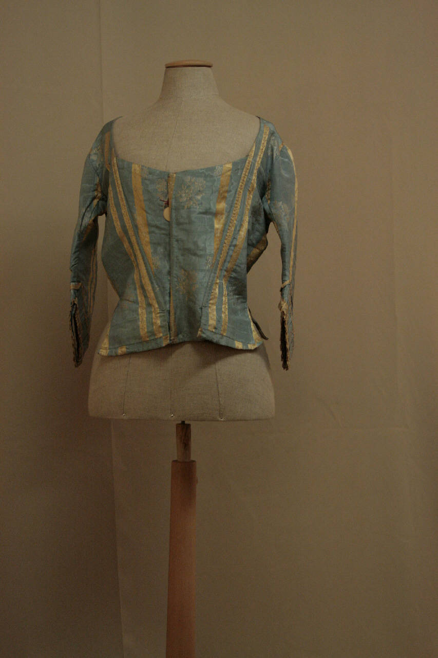 Corsetto confezionato in pekin lanciato marezzato: si susseguono righe giallo senape in raso decorate da sinuosi tralci fioriti a più larghe righe azzurre in gros, marezzato e ornato da mazzi di fiori; i decori son ottenuti da una trama lanciata bianca. Ampio scollo quadrato, allacciatura anteriore nascosta definita da sette ganci, falde dritte. Il corpino è modellato da tagli, posti sia anteriormente che sul dorso, dov'è presente anche la cucitura posteriore centrale e falda mossa da pieghe. Manica in due pezzi sagomati, tagliata sotto il gomito e con polso ottenuta da una striscia arricciata di pekin, rifinita ai margini da un nastro in tafetas giallo . Fodera in tela di lino beige. Il busto è irrigidito da quattro stecche