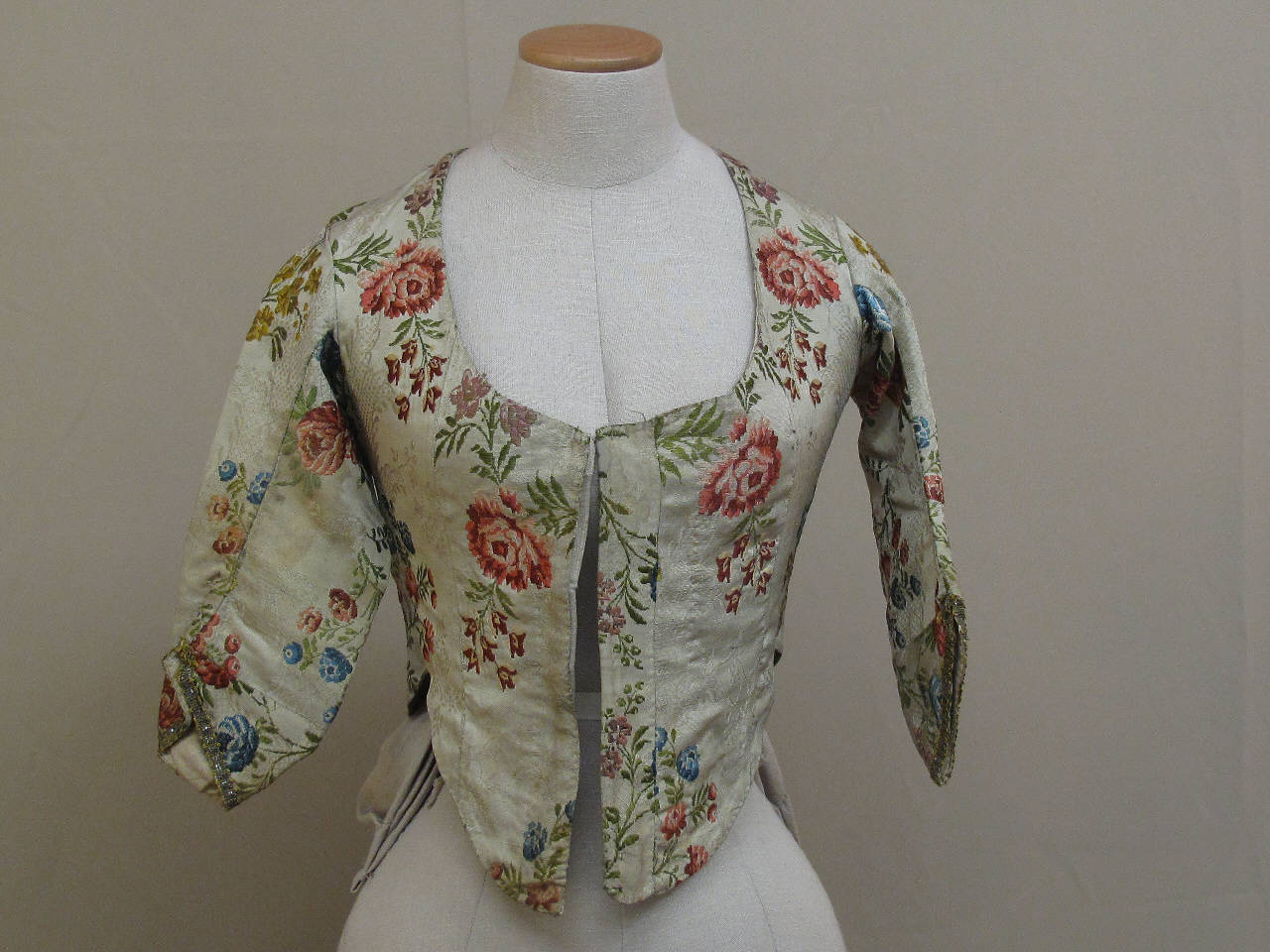 Corsetto confezionato in taffetas liserè broccato lanciato: sul fondo bianco si stagliano firo policromi realizzati con trame broccate e lanciate (seta verde) , intrecciandosi con motivi di nastri sinuosi eseguiti slegando la trama di fondo. Ampio scollo quadrato, allacciatura anteriore nascosta definita da sei occhielli; con falde sagomate;corsetto modellato anteriormente e posteriormente da tagli e dalla cucitura centrale. Falda posteriore mossa da pieghe. Manica in due pezzi sagomata, tagliata sotto il gomito e rifinito all'orlo da un galloncino in seta e decorato e oro. Fodera in tela di lino beige. Il busto è irrigidito da due stecche.