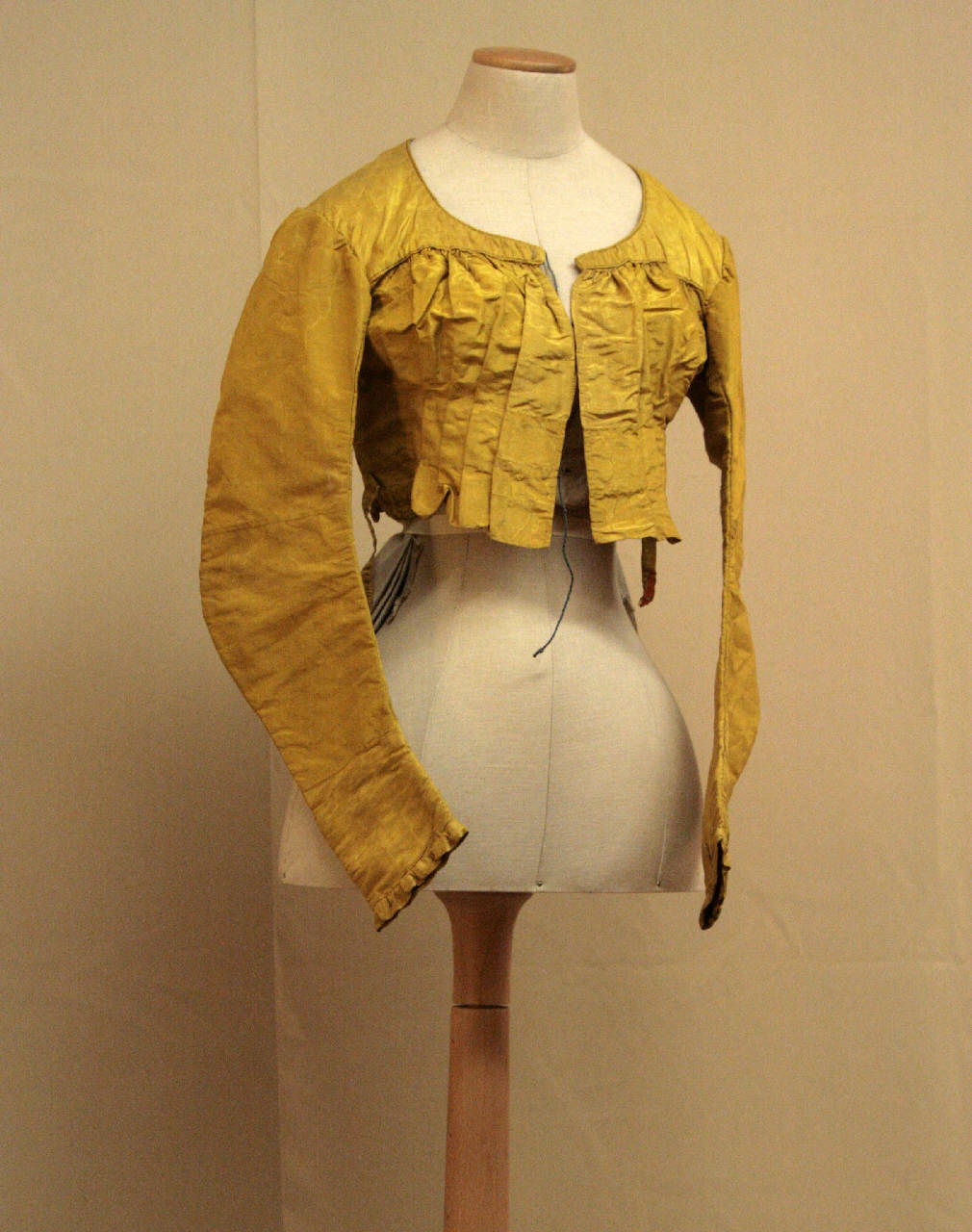 Spencer confezionato in taffetas giallo marezzato. Scollatura con coulisse, sprone dritto da cui parte una ricca arricciatura che, all'altezza della vita, è trattenuta da pieghe che, sul rovescio sono tenure da una striscia in tela d lino. Dorso modellato da tagli e dalla cucitura centrale. Al'altezza della vita è posta una cintura, i cui lembi proseguono anche alteriormente, e a cui è cucito un voulants.. Manica sagomata in due pezzi, con taglio all'altezza del polso, reso aderete da un bottone e una asola. Il capo è doppiato in tela di lino ècru che sul davanti forma un busto separato e chiuso da lacci che passano attraverso sei occhielli.