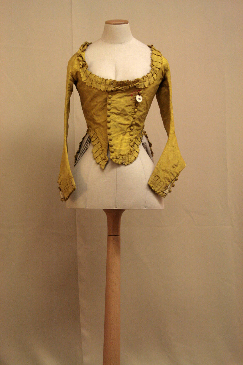 Corsetto confezionato in gros giallo. Ampio scollo sagomato, rifinito da una rouches pieghetata, allacciatura nascosta imprezosita da 22 bottoni non funzionali rivestiti in tessuto, falda sagomata; dorso modellato da tagli e dalla cucitura centrale, con falda mossa da pieghe. Spalla spostata verso il dietro, Manica in due pezzi sagomata, con spacco al polso chiuso da tre occhielli e latrettant bottoni rivestiti in tessuto. Il polso è rifinito da una rouches pieghettata che percorre anche l'intero irlo delle falde. Il capo, ad esclusione delle falde, è doppiato in tela di lino beige.