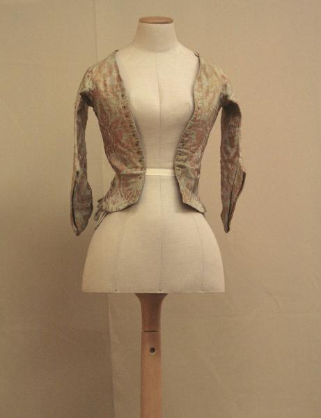 Corpino confezionato in lampasso lanciato: sul fondo in taffetas azzurro si stagliano trionfi vegetali stilizzato, definito da una trama salmone. Corpino completamente aperto anteriormente, con falda lunga dritta; l'allacciatura sagomata è percorsa da dieci occhielli. Il dorso, modellato dalla cucitura centrale, ha falde lunghe, con spacco finale. Manica en raquette in due pezzi dritta sagomata, con paramano a ventaglio di pieghe sotto il gomito. Doppiato in tela di lino beige, mentre per le maniche e il bordo della allacciatura è stata impiegata tela color salmone.