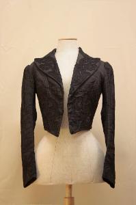Bolero in taffettas nero percorso da fitte pieghe, collo con reversi a lancia, modellato da pinces, orlo modellato a punta, chiusura data da due ganci; dorso struttuarto da tagli, con taglio centrale; maniche sagomate dritte lunghe. Sul doso, sui fianchi, sulle maniche e sul collo è posto un ricamo ad applicazione definito da faleme ritagliat in panno e rifinite da cordoncino nero. Fodera in taffetas nero.