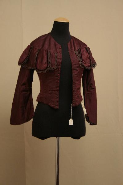 Corpino in raso granata, scollo a girocollo, spalla verso il retro, allacciatura sagomata definita da 18 ganci, sull'allacciatura sono cuciti sette bottoni non finzionali rivestiti in seta. Sprone sagomato che continua anche sul retro, a cui è cucita una mantellina dritta inoreziosita da pannelli con orlo arrotondato (tali elementi sono foderati in taffetas di seta rosa scuro) e rifinito con un nastro on velluto di seta granata e da una passamaeria in cordoncino di seta marrone e nocciola. Il corpino è sagomato da tagli ed ha la vita a punta. Dorso con cucitura centrale. Manica ad un pezzo, svasa, con pinces all'altezza del gomito, senza pala. Il corpino è doppiato in tela cerata beige, tranne per le mabniche foderate con un pekin in seta. Il corpino è strutturato da undici stecche e presenta il nastri stringivita.