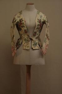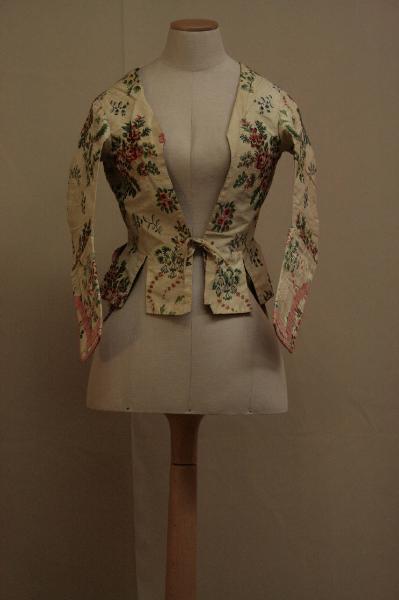 Corpino realizzati in taffetas doublé liserè broccato: sul fondo écru si stagliano fiori policromi, nelle tonalità del verde, rosa e rosso, azzurro e celeste e in seta riccia gialla, con motivi a nastro sinuoso defniti dalla slegatura delle trame di fondo. Ampissima scollatua sagomata a V che rriva fino al punto vita, falda lunghe resa ampiada un taglio triangolare; dorso modellato da un fianchetto e dalla cucitura centrale, con falde lunghe. Manica sagomata in due pezzi, con taglio orizzontale all'altezza del gomito. L'orlo delle falde posteriori è percorso da un nastro in taffetas rosa, che percorre anche il polso della manica, parzialmente aperto e con due occhielli. Lo stesso nastro è applicato sulla parte terminale della manica, creando n motivo di paramano. Allacciatura definita da una coppia di fettucce in tela di cotone. Fodera in tela di lino nociola