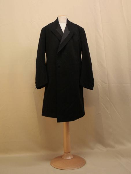 Completo con giacca, pantaloni e gilè in panno nero. Giacca finanziera in panno nero, a doppio petto, con collo con risvolti in diagonale di seta nero, abbottonaura con sei occhielli e bottoni rivestiti in tessuto; modellata da pinces; taglio in vita, a cui si uniscono le falde lunghe e dritte unendosi sul dorso in due spacchi chiusi in fondo e segnati da un bottone; dorso con tagli e cucitura centrale. Maniche in 2 pezzi con polsino con spacco chiuso da tre bottoni. Fodera in diagonale di lana nera e, per le maniche, in raso di seta; due tasche interne. Pantalone lungo classico, con alta cintura e modellato da pinces. Chiusura nascosta mediante patta dove sono sette bottoni e altrettanti occhielli e un gancio. Tasche inserite nella cucitura dei fianchi e una a filetto orizzotale sul retro, dove, all'altezza della cintura, è un cinturino con fibbia e uno spacco al centro della vita. Fodera all'altezza della vita. Gilè ad un petto, scollo a V, tagliato in vita, con quattro occhielli e quattro bottoni, quattro tasche con patta cucita. Dorso in diagonale di lana nero, con gheroni alla vita, cucitura centrale e cinturino con fibbia in metallo. Fodera in diagonale di cotone stampato. Lungo lo scollo sono cuciti sei bottoni che trattengono un nastro di cotone con sette occhielli.