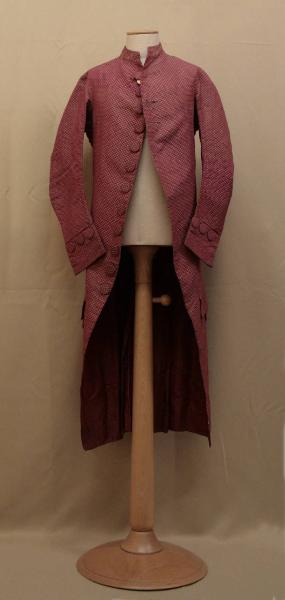 Marsina confezionata in cannetile color vinaccia, decorato da minuti motivi a quadrifoglio eseguiti con una trama supplementare lanciata verde acido. Alto colletto a fascia, mostre molto sfuggenti dove sono12 grandi bottoni rivestiti in tessuto e due asole (in corrspodenza del terzo e quarto bottone). Tasca con patta e decorata da quattro bottoni. Falde che si riuniscono posteriormente in piegoni, fermati da due bottoni e spacco centrale, punto vita ribassato segnato da bottoni. Maniche in due pezzi dritta, terminante con paramani con tre bottoni. Fodera in diagonale cangiante (ordito viola e trama nocciola)