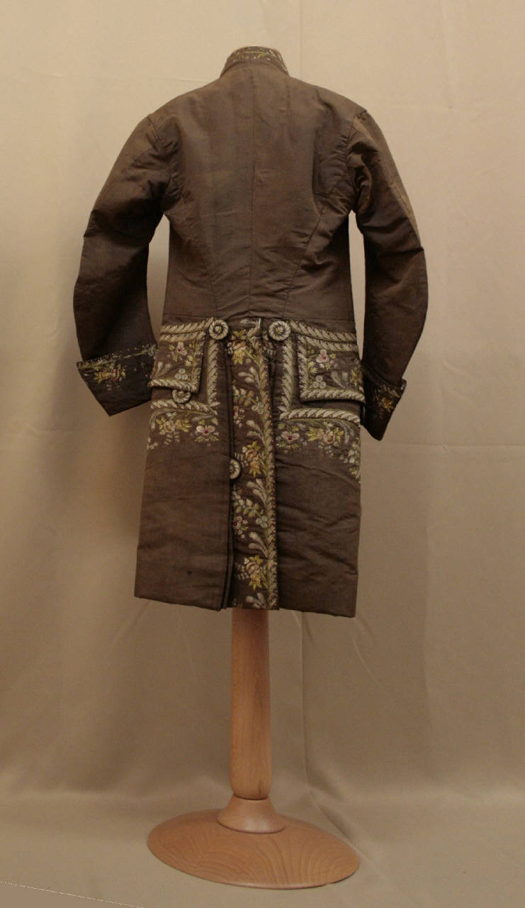 Marsina confezionata in gros color caffè ricamato in seta policroma, creando un disegno floreale. Alto colletto a fascia, mostre molto sfuggenti dove sono sei grandi bottoni rivestiti in tessuto e ricamato. Taglio in vita. Tasca con patta sagomata e decorata da tre bottoni. Falde squadrate e sfuggenti che si riuniscono posteriormente in piegoni, fermati da due bottoni e spacco centrale, maniche in due pezzi dritta, terminante con paramani con tre bottoni- Fodera in taffetas avorio e maniche foderate in raso.