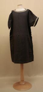Il costume è a forma di tunica, con scollo a barca sottolineta da fettucce in cotone bianca, linea dritta, orlo al ginocchio e maniche corte ampie a chimono, con il bordo rifinito coe lo scollo. Passanti ai fianchi. Il dorso è uguale al davanti. Il capo è confezionato in diagonale di lana nero.