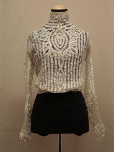Blusa con alto collo ad anello, maniche dritte molto lunghe, corta in vita segnata da una cintura, apertura completa sul dorso. La blusa è interamente confezionata da nastri in taffetas di seta uniti fra loro da ricami in cotone atti a formare un pizzo rinascimento, creando motivi vegetali stilizzati.