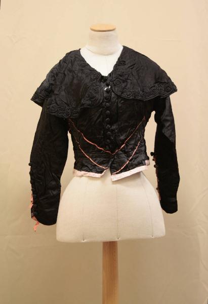 Corpino confezionato in raso nero. Ampio collo pellegrina, decorato lungo il bordo, da un ricamo eseguito in spighetta e cordoncino in seta nera, ripiegati a girali, abbottonatura totale centrale ottenuta da sei automatici, unitamente ad un gancio e decorata da da undico bottoni non funzionai ricoperti di fili di seta. Il corpino è decorato da bande diagonali in seta rosa ed è modellato da pinces che partano dalla vita; dorso con tagli e cucitura centrale, anch'esso decorato da bande rosa. Manica dritta in un pezzo con spacco al polso, bordato di raso rosa, chiuso da cinque automatici e sette bottoni non funzionali. Fodera in tela di lino rosa chiusa anteriormente da sei ganci. Le cuciture sono rifinite con fettucce di cotone nero. Nastro stringivita chiuso da un gancio