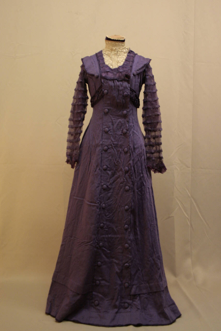 Completo formato da soprabito e abito in raso di lana lilla. Soprabito monopetto con scollo a V, apertura centrale decorata da un fiocco in spighetta e da un bottone rivestito in tessuto, abbottonata mediante due ganci e asole, sottolineate da un pannello decorato da cinque bottoni;bottoni decoro sotto al seno sottolineato da cinque bottoni. Falde lunghe, svasate verso l'orlo. Dorso in un pezzo, con decoro all'altezza delle scapole, impreziosito da sei . Maniche arricciate sagomate in un pezzo, con quattro bottoni al polso. Il tessuto è doppato con una teletta molto rada in cotone bianco, fodera in taffetas viola chiaro. Abito princesse, con colletto a fascia allacciato dietro e guimpe in merletto bianco, scollatura quadrata con pizzo lilla, impiegato anche per le maniche doppiate in organza di seta, colletto pelllegrina con un bottone. Abbottonatura parziale con bottoni a pressione; i tagli sono sottolineati da 24 bottoni, linea svasata; un decoro sotto il seno che segue anche sul dorso, dove ritornano i tagli sottolinati dai bottoni. Il busto è oderato in tela di cotne glicine chiuso anterirmenet da ganci e su cui sono applicate le stecche, foderate con fettuccia, e il nastro stringivita