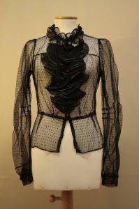 Camicetta cofezionata in tulle nero. Collo a ruches, sprone drito e taglio in vita, da cui parte una breve baschina che continua anche sul dorso. Allacciatura, data da un bottone rivestiti in tessuto e da otto bottoni a pressione, nascosta da un ricco jabout, lungo fino alla vita, profilato in raso nero. Maniche in un pezzo, con pinces all'altezza dei gomiti e polsini chiusi da tre bottoni e altrettanto asole.\nBusto in taffetas doppiato in pizzo decorato da motivi floreali nero. Coppe safgomate sostenute da sottili bretelle, corpo con cucitora centrale che prosegue sul dorso dove è presente la chiusura, data da sei bottoni che si uniscono alle asole ricammate su tre elastici. Dal busto pendono cinque elastici. Bretelle in raso. Sul rovescio è cucita l'etichetta.