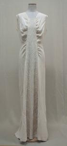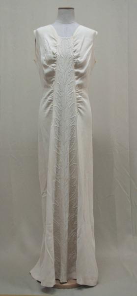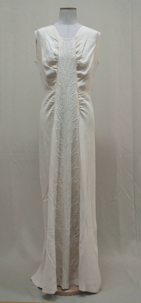 Completo formato da bolero e abito in crespo avorio, senza maniche, con un leggero drappeggio che parte dalle spalle, con scollo a V. Sul davanti corre, al centro, un pannello che si allarga verso l'orlo e che accoglie il ricamo in perline di vetro trasparente e opale ce disegna una foglia frastagiata. Taglio in vita, con corpino drappeggiato. Sul dietro, al centro è la cerniera lampo, inserito entro una cucitura da cui diparte una leggera increspatura. La gonna si svasa verso il fondo, grazie al taglio centrale e a due gheroni. Sulle spalle sono cuciti i nastri per bloccare le bretelle del reggiseno. Bolero con scollo a girocollo, modellato aneriormente da un taglio verticale e in apiega aperta alla vita; dorso in un pezzo con pinces sulle sdpalle. Maniche lunghe con pinces sulla pala.