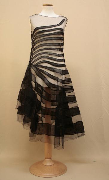 Abito con scollo a barca, privo di maniche e con orlo assimetrico, confezionato in tulle nero e docorato da bande in tulle nero che forma un disegno a cerchi irregolari concentrici che, partendo dal seno, arrivano sino all'orlo.