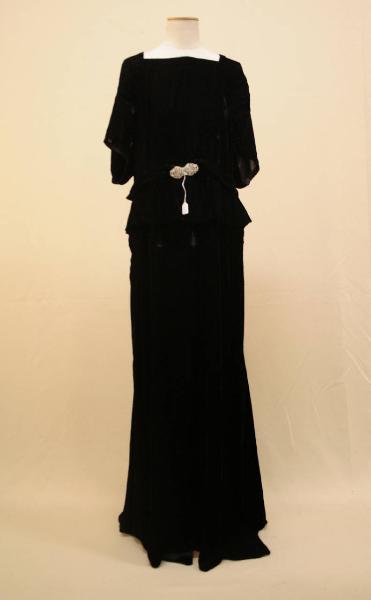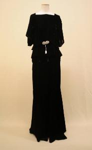 Abito da sera in velluto nero, con scollo anteriormente quadrato e posteriormente a barchetta, corpino tagliato in vita, da dove parte una corta baschina morbida; il punto vita è segnato da una cinturina con fibia in strass. Il dorso è privo di tagli fino all'altezza delle ginocchia, dove parte un pannello ampliato da gheroni e che forma lo strasico. Sul dorso è presente una apertura a goccia che termina a metà schiena. Maniche corte arriccite e che sembrano imitare una mantellina.