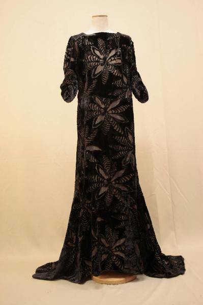 Abito da sera confezionato iun velluto tagliato nero, laminato in oro dorato, decorato da grandi motivi floreali stilizzati. Scoolo quadrato anteriormente e a V posteriormente, manich dritte al gomito. Il busto, con taglio in vita, è modellato anteriorente da tagli. Dalla vita diparte la gonna svasata al fondo grazie a tagli presenti sia anteriormente che posteriormente. Sul dietro è presente un breve strascico