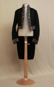 Frac in panno nero ricamato con un tralcio di quercia. Collo alto a fascia, mostra squadrata tagliata in vita, tasc con patta sagomata, falde ad orlo squadrato e tagliato con spacco posteriore decorato da un bottone in metallo con stemma; tasca inserita nel taglio del dorso. Maniche in due pezzi sagomate con polso ricamato. abbottonatura nacosta data da nove occhielli. Fodera in diagonale di seta, imbottita sul petto