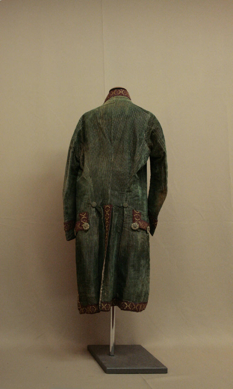 Marsina confezionata in velluto operato tagliato liserè: il fondo è ripartito in minute righe ottenute sia dal velluto verde che dalla slegatura delle trame di fondo ora rosa e écru. Alto colletto a fascia, mostre molto sfuggenti, bordate, come il colletto, con un alto gallone rosso decorato da fiori stilizzati gialli, dove sono tre grandi bottoni ricamati e tre asole funzionali (altre cinque sono state coperte dal gallone), tasca con patta sagomata e decorata da tre bottoni rivestiti in tessuto, mentre tre bottoni come quelli della mostra sono appicati sulla patta. Falde che si riuniscono posteriormente in spacchi laterali chiusi, dove sono state inserite tasche nella cucitura, e centrale aperto, rifinito dal gallone, punto vita ribassato segnato da bottoni rivestiti in tessuto. Maniche in due pezzi dritta, terminante con paramani con tre bottoni rivestiti in tessuto. Colletto e falde foderati in raso di seta écru, dorso e maniche in tela di lino.