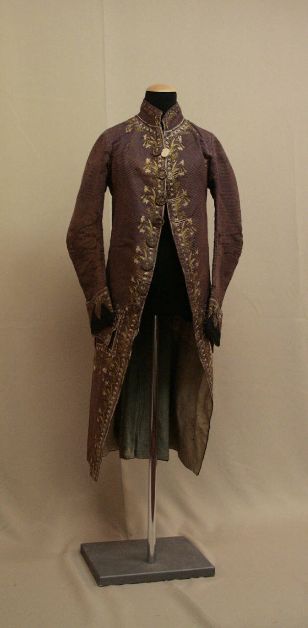 Marsina confezionata in cannetille color vinaccia ricamato con motivi vegetali in seta policroma a con alcuni dettagli in tulle o con nastri in taffetas ricamato. Alto colletto a fascia, mostre molto sfuggenti dove sono otto grandi bottoni rivestiti in tessuto e tre asole. Tasca con patta e decorata da quattro bottoni. Falde che si riuniscono posteriormente in piegoni, fermati da due bottoni e spacco centrale, punto vita ribassato segnato da bottoni. Maniche in due pezzi dritta, terminante con paramani con tre bottoni. Fodera in tela di lino azzurra per il dorso, in diagonale di seta avorio per le mostre e tela di lana per le maniche.