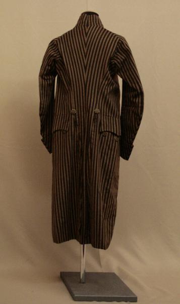 Marsina in panno solcato da righe marroni e beige. Alto colletto a fascia, mostre molto sfuggenti dove sono sette grandi bottoni ricamati in seta con un motivo a stella a sei punte e tre asole, in corrispondenza del terzo, quartoo e quinto bottone. Tasca con patta sagomata e decorata da tre bottoni. Falde sfuggenti che si riuniscono posteriormente in piegoni, fermati da due bottoni e spacco centrale, punto di vita ribassato.Mniche in due pezzi sagomate con paramani con due bottoni. Fodera in diagonale di seta, per le maniche e i dorso in tela di lino.