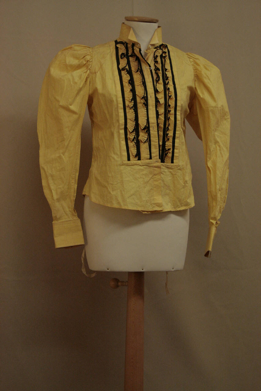 Camicia in tela gialla, collo a cinturino con le punte ripiegate, sparato decorato da una coppia di rouches plissettate e rifinite con una fettuccia nera che ritorna anche sullo sparato. Allacciatura definita da cinque asole e altrettanti bottoni,. Manica lunga in un pezzo, molto arriccita al punto del giro manica e terminante con un polsino con due occhielli. Dorso in un pezzo, con una coulisse al punto vita, solo al centro, dove passa una fettuccia. La zone dello sparato è foderata in tela di cotone bianco. Fettucce in tela di cotone rifiriscono le cuciture delle maniche.