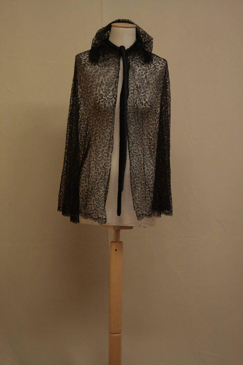 Mantella corta in vita, a sezione circolare, con cappuccio, confezionata in pizzo nero decorato da un motivo ad agrifoglio. Chiusa al collo da un nastro in seta nero.