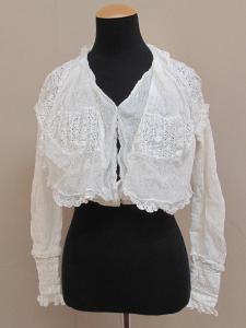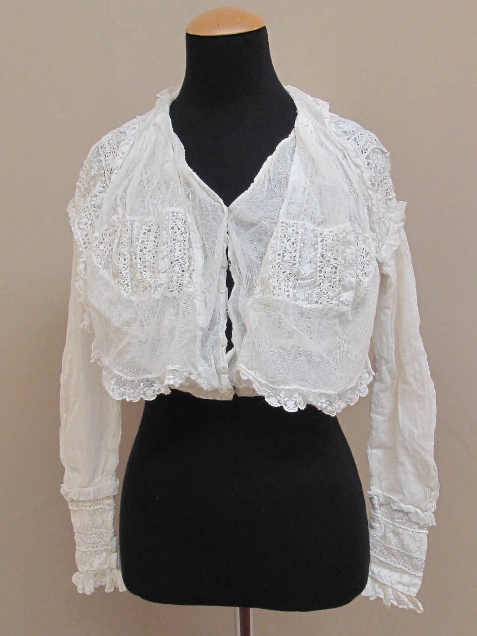 Camicia in più strati di tulle di cotone, con collo semplice da ui diparte un ricco risvolto decorato da un pannello rettangolare in pizzo e ribattuto da un basso merletto. Il risvolto nascnde l'atissino sprone dritto, decorato da bande di pizzo; un motivo che ritorna anche sul dorso. L'abbottonatura è definita da una chiusura nascosta, data da quattro bottoni a pressione, su cui sono cuciti otto bottoni in madreperla non funzionali. Maniche lunghe in tulle, con il giro manica sottolineato da una alta rouches che ritorna anche all'altezza del polsino, secorato come lo sprone e termnante con una balza di pizzo.