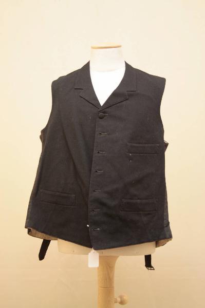 Gilet maschile ad un petto, collo con risvoli e tre tasche con patte cucite. Sette bottoni rivestiti in tessuto chiudono anteriormente il gilet.. Dorso in rasatello di cotone nero con cucitura centrale e modellato da una cinturina con fibbia metallica. Fodera interna in diagonale di cotone bianco stampato cn un motivo a piccole righe