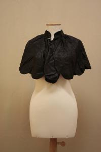 Mantellina in taffetas nero con collo a cinturino, da cui parte la mantellina a ruota, arricciata al collo, creata da più tasselli e orlo smerlato, fra le smerlature sono presenti tracce di tulle in seta nera. Il colletto e un tassello sono in taffetas leggermente più pesante.