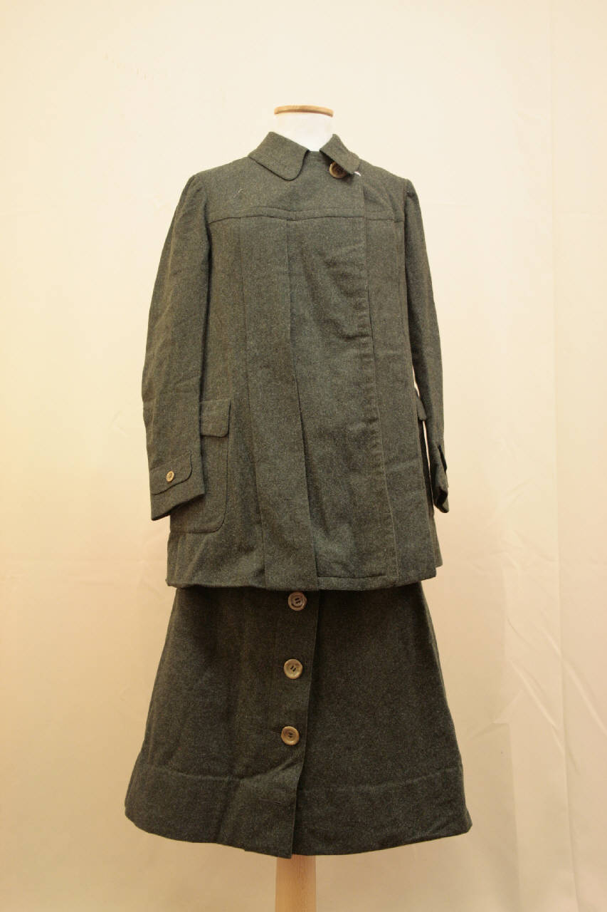 Completo costituito da abito e giacca confezionato in panno di lana verde militare; fodera in raso di seta avorio. Lunga giacca dalla linea diritta, con collo semplice piatto e sprone dritto e due pieghe piatte all'altezza del seno; tasche applicate con patta dritta. Anche il dorso presenta due pieghe piatte che nascondono, coe quelle anteriori, dei passanti per una cintura. Maniche lunghe in due pezzi con, all'altezza del polso, un motivo a pattina . Sul capo sono applicati cinque bottoni in corno: due sulle patte delle tasche, altri due sulla patte della manica ed uno al colletto. Altre tre bottoni a pressione chiudono l'apertura. \nGonna lunga svasata, aperta davanti e chiusa da 7 bottoni in corno; alta fascia in vita in gros di seta provvista di sei stecche echiussa da ganci e un bottone a pressione. La gonnna è stata confezionata con un telo e modellata, sui fianchi, da pinces.
