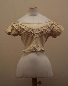 Corpino in tela di lana avorio, con scollo a barca, rifinito da una gala in crespo avorio e merletto in seta, su cui è stato fatto passare un nastro in raso avorio; modellato da tagli e pinces, con sprone arrotondato, da cui partono due gale arricciate degradanti, corte falde e abbottonatura completa al centro, data da cinque bottoni e altrettranti occhielli. Dorso con tagli struturato come il davanti Corte maniche arricciate e drappeggiate. Doppiato fino in vita in tela di lino avorio con sette stecche.