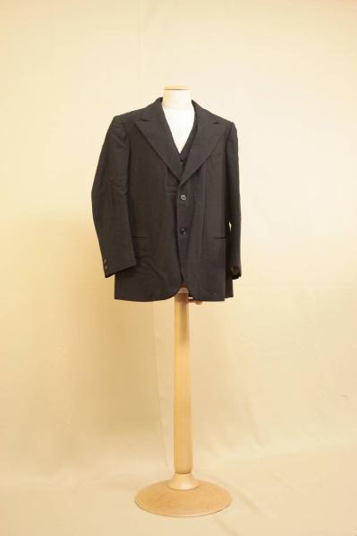 Completo spezzato composta da giacca, gilet, in panno nero, e pantaloni in spigato di lana nera e grigia. Giacca ad un petto, con collo con risvolti, a lancia, abbottonatura con due occhielli e bottoni, due tasche tagliate orizzontalmente e, sul petto, una tasca con patta cucita, orlo stondato all'abbottonatura, dorso con cucitura centrale; maniche in due pezzi con polso sottolinetao da due bottoni; fodera in tela nera e taffetas sintetico per le maniche stampato a righe; tasche interne. Gilet ad un petto, tagliato in vita e chiuso da sei bottoni con altrettanti occhielli; quattro tasche con patta cucita; dorso in tela nero con cucitura centrale e cinturino con fibbia metallica. Fodera in diagonale di cotone stampato. Pantalone lungo classico con risvolto, vita segnata da una cintura con sei bottoni e con spacco al dietro, dove è stato posto il cinturino; chiusura nascosta mediante patta dove sono sette bottoni e altrettanti occhielli. Tasce tagliate orizzontalmente sul dietro e inserite nelle cuciture sui fianchi. Fodera al'altezza della vita in diagonale stampato, al di sotto è l'etichetta.