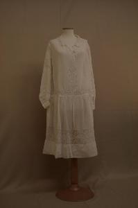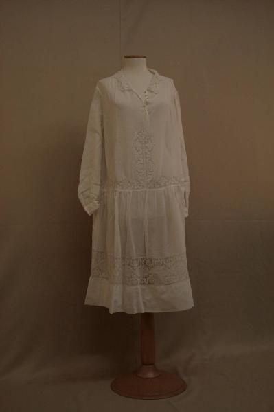 Abito a vita bassa confezionato in mussola bianca con inserti di filet decorato da motivi vegetali stilizzati. Abito con collo semoice, apertura centrale, con chiusura definita da cinque bottoni ricoperti in cotone, con asole ricamate, nervature sella spalla, manica blusante con polsino chiuso da due bottoni; al taglio vita all'altezza dei fianchi, sottolineato da una cintura, si unisce la gonna arriciata. Collo in filet e inserti di tale merletto sono sul busto, anteriormente, e sulla gonna.