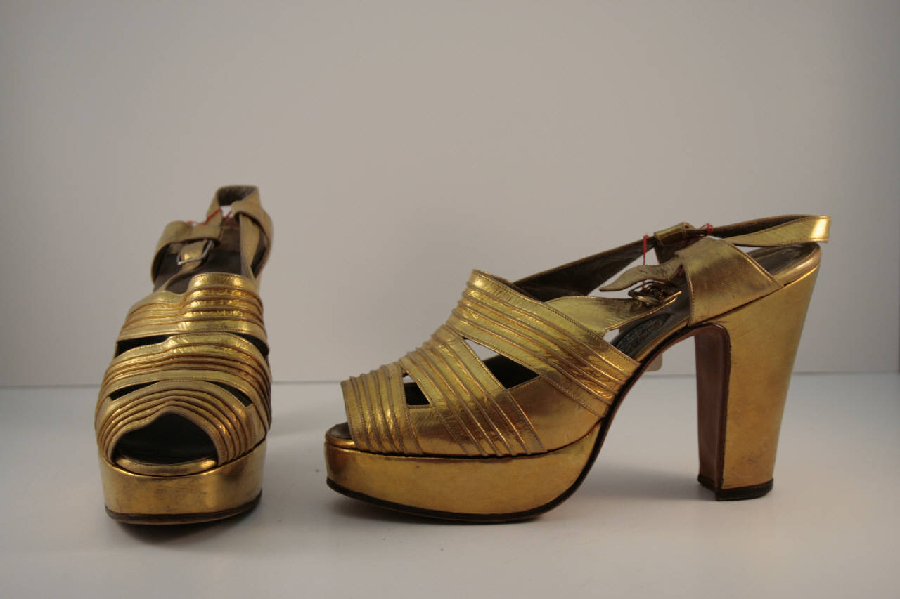 Scarpa con mascherina definita da tre nastri con nervature a rilievo, a cui di unisce il cinturino che passa intorno allacaviglia. La mascherina è in pelle dorata; interno e soletta in pelle grigia. Alto tacco. Suola in cuoio che continua anche sul tacco dritto foderato in pelle dorata, come l'alto plateau. Etichetta sulla suoletta.