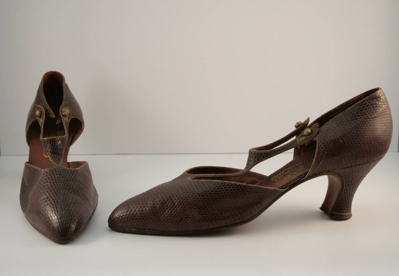 Scarpa con tomaia in pelle di lucertola marrone in due pezzi, punta a punta, mascherina unita al cinturino sagomato chiuso da una coppia di bottoni a rosa, con occhielli. Profili in pelle dorata. Fodera e suoletta in pelle color nocciola, con punta in tela ècru. Suola in cuoio che continua anche sul tacco a coda, rivestito in pelle sdi lucertola. Nome inpresso sulla soletta.
