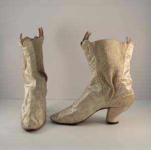 Stivaletto in raso bianco, con cucitura al centro, sul retro e sul davanti, evidenziano la punta a coda di rondine; le cuciture sono sottolineate da impunture; gheroni ai fianchi in elastico. Fodera in tela di lino, con orlo in raso rosa, tiranti in fettuccia di cotone. Suoletta in pelle marrone. Suola in cuoio e tacco a coda rivestito in raso bianco.