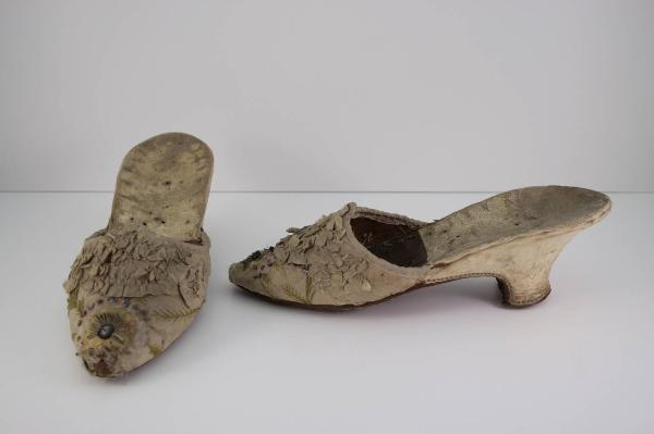 Pianella con tomaia in raso avorio, sagomata sul collo del piede, dove sono applicate gale arricciate in taffetas, punta quadrata impreziosita da ricami in sete verde e gialla che fomano tralci fronzuti, canutiglia e paillette. Fodera e soletta in pelle marrone e soletta in pelle bianca in corrispondenza del tallone. Suola in cuoio che continua anche sul tacco a coda foderato in pelle bianca;. suola percorsada cuciture.
