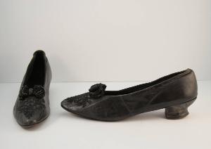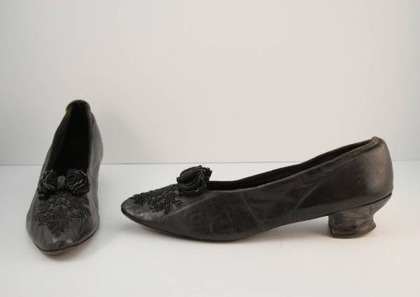 Scarpa con tomaia in pelle nera in tre pezi cuciti, punta affusolata leggerente sollevata, con mascherina decorata da un ricamo a jais che definisce un motivo vegetale stilizzato, fiocco in raso nero ricamato con jais; fodera e suoletta inraso nero. Suola in cuoio, tacco a coda rivestito in pelle nera. Forma in legno definita da un elemento orizzontale sagomato, da inserire nella scarpa, provvisto di un foro entro cui far passare un piolo, provvisto di una sfera da inserire nella scarpa, in corrispondenza del tallone; avvitando il piolo, la forma si adatta all modllo della scarpa.