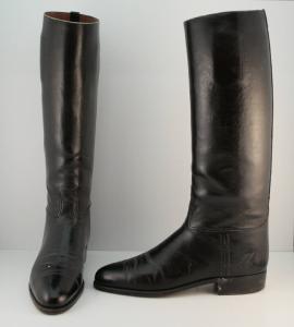 Stivale con tomaia in tre pezzi cuciti, gambale dritto con tirante in pelle; interno in pelle nocciola con due tiranti in fettuccia in diagonale di cotone ècru, cuciti lateralmente. Suola in cuoio e tacco basso a strati. Marchio impresso sulla sola. Forma in legno, costituito da tre elementi a foggia di polpaccio che si incastarno fra loro, uno dei quali presenta anche il piede mobile; 'elemento cenrae presenta un anello in metallo.