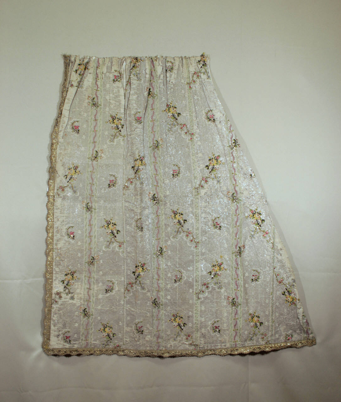 Pannello trapezoidale confezionato in taffetas rigato (bianco e ferve) laminato e broccato in argento e seta policroma, decorato da tralci sinuosi fronzuti e mazzetti di fiori policromi; il decoro è ulteriormente sottolineato da ricami in canutiglia, pailettes dorate e laminette in meallo smaltato. Il bordo è rifinito con un gallone in seta gialla e oro filato e lamellare, con bordo smerlato e decorato da un tralcio fronzuto. All'altezza della vita sono le tracce di pieghe aperte, trattenute da una cintura. Doppiato in tela di lino écru.